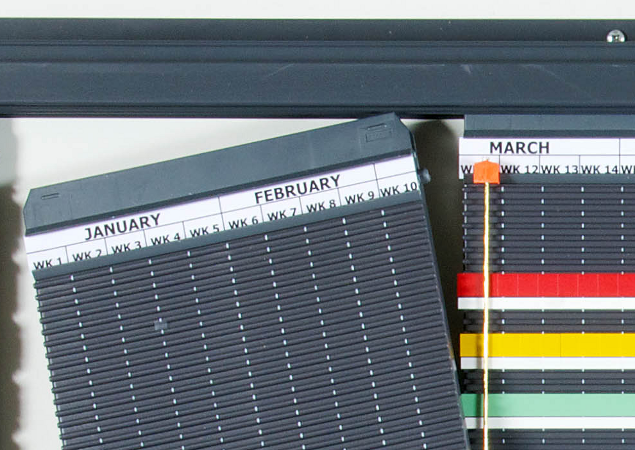 Double tracked wall rail set for use with the 60, 120, 180 planning line depth systems. Rear track holds modular planning system with front track accomodating sliding index panels
