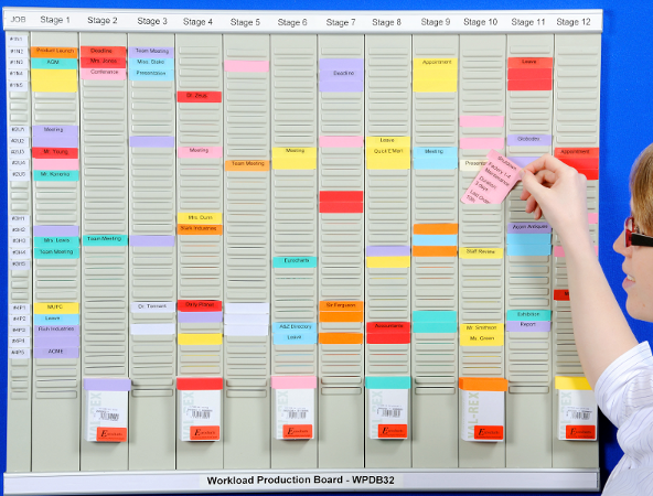 Schedule workload plans by date or production stage, forming a custom scale T-Card planning display board
